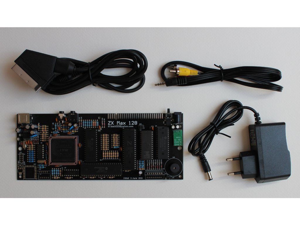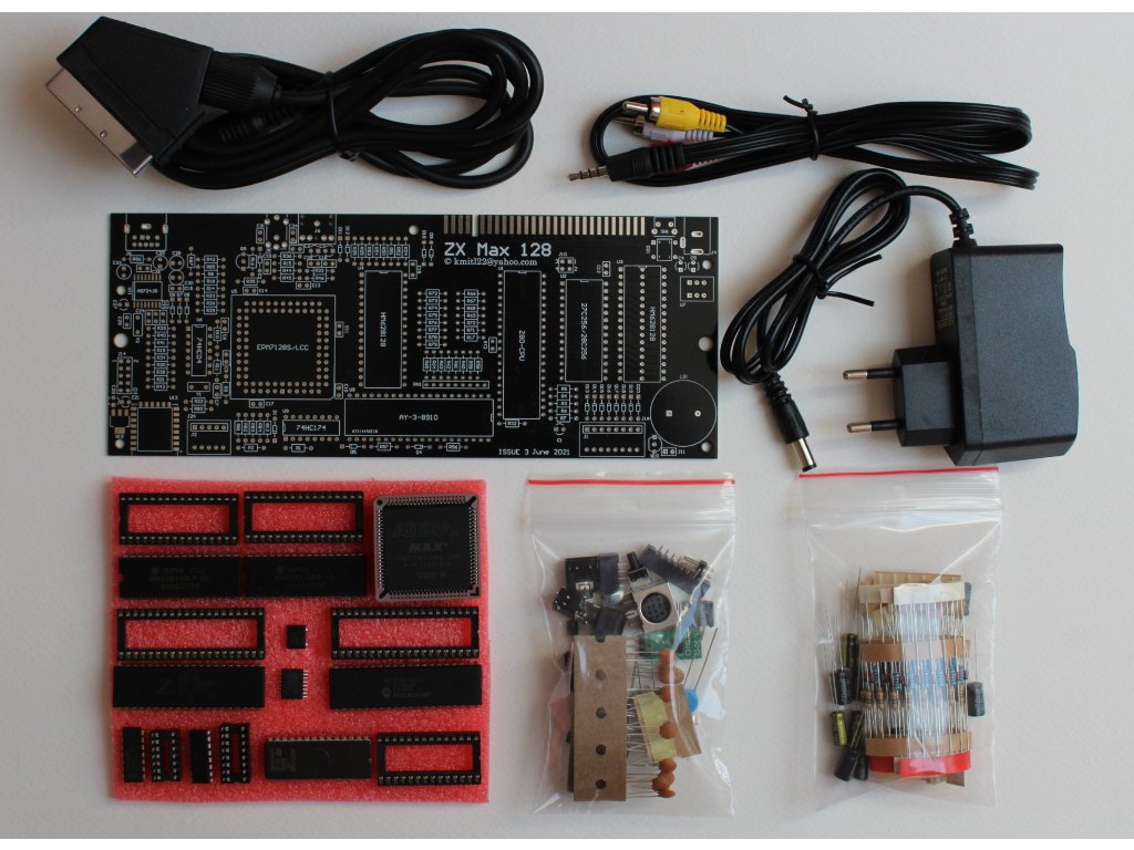 You will receive kit of components for DIY assembly, AV cable and 12V/1A power supply. All chips are tested with ZX MAX 128 board.